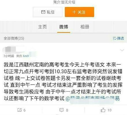 6月7日晚,有多位網(wǎng)友反映,江西省贛州市定南縣有4個高考考場發(fā)錯試卷。定南縣教體局證實,當(dāng)天的語文考試,確實有4個考場發(fā)錯了試卷,當(dāng)?shù)亟逃块T調(diào)取備用試卷并將考試時間延后,語文科目于下午一點鐘考試結(jié)束。目前,事件原因正在調(diào)查中。