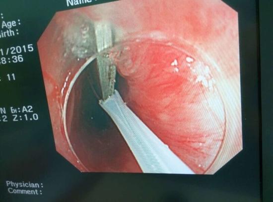 隨后,范醫(yī)生先用圈套器套取出了長10厘米的鑷子,再一個一個地取出了打火機。整個取出過程小心謹(jǐn)慎而又一氣呵成,只用了不到10分鐘。