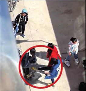 視頻顯示,至少有10人對穿旱冰鞋的黑衣女孩進(jìn)行圍毆,有的男生嘴里叼著煙,邊打邊罵,發(fā)出笑聲。一個紅衣女生腳蹬旱冰鞋,猛地躥起來將黑衣女孩踹倒在地,另一名女生緊隨其后,左右開弓狂扇女孩耳光11次,視頻中清脆的打臉聲音令人不寒而栗。
