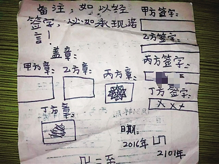 記者看到,這份合同規(guī)定由甲乙丙丁四方簽署,分別代表父、母、小雪和未來(lái)的弟弟或妹妹。條款規(guī)定大致如下:1。生了二胎以后(無(wú)論男女、龍鳳、雙胞胎),甲方乙方不可偏心丁方,要以從前那種態(tài)度對(duì)待丙方。2。不可以丁方太小或經(jīng)濟(jì)不寬裕為由,克扣丙丁雙方的吃穿用度。該條款下具體擬定了衣服、喝奶和飲食要求,如丁方每月3件衣服,每天必須喝奶,哭了爸媽必須安撫;自己作為丙方,每月2件裙子,飯食飲水不可少一件,自己可以照顧弟妹,不可偏心。以上條款經(jīng)過(guò)簽字,必須兌現(xiàn)承諾。合同期限為2016年~2101年。甲乙丙丁四方分別留有簽字、蓋章的空格,其中丙方的簽字和蓋章(圖畫(huà))已簽署完畢。