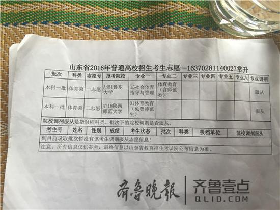 陜西師范大學(xué)在山東招收6名體育教育專業(yè)的學(xué)生,均為免費(fèi)師范生。第一志愿的錄取線為文化課362分,專業(yè)課66.54分。學(xué)校按照專業(yè)課成績由高到低擇優(yōu)錄取。常升的文化課考了403分,專業(yè)課考了93.64分,遠(yuǎn)超出學(xué)校的錄取線。而魯東大學(xué)官網(wǎng)顯示,該校社會(huì)體育指導(dǎo)與管理專業(yè)的文化課最低錄取分?jǐn)?shù)為407分,而常升的文化課成績差4分。不過,該校對專業(yè)課要求低,專業(yè)課成績最高分僅為77.65分。