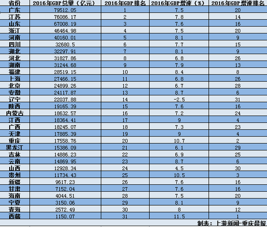 隨著2月19日海南省兩會開幕,地方兩會時間進(jìn)入尾聲,2016年各地GDP數(shù)據(jù)也已全部出爐。上游新聞-重慶晨報記者根據(jù)各地政府工作報告和統(tǒng)計部門數(shù)據(jù)發(fā)現(xiàn),GDP總量達(dá)到3萬億元以上的省份增至9個。