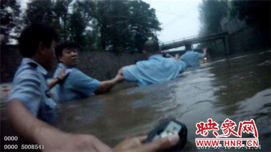 7月16日19時(shí),新密市突降暴雨。19時(shí)30分許,正在附近執(zhí)行任務(wù)的新密市公安局西大街派出所民警呂鵬輝和輔警張靖、韓耀鵬、張文龍、張永康等接110指令:于家崗鐵路橋處有人被困在水中,請(qǐng)馬上前去解救。