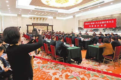 10月19日下午,河南代表團在人民大會堂河南廳討論黨的十九大報告。(記者 董亮 杜小偉/攝)