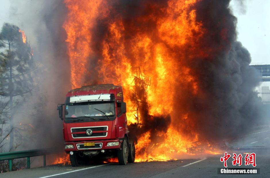 1月23日下午4時(shí)許,滬昆高速公路江西弋陽(yáng)往貴溪方向593公樁(貴溪收費(fèi)站附近)一輛載有133部電動(dòng)車的半掛車起火,導(dǎo)致電動(dòng)車被大火“吞噬”。江西貴溪消防官兵接警后迅速到場(chǎng)撲救,半小時(shí)后將大火撲滅。據(jù)司機(jī)稱,火災(zāi)疑因高速護(hù)坡雜草叢起火產(chǎn)生的火芯飄至半掛車,引燃包裝電動(dòng)車的紙殼箱所致。中新社發(fā) 龔武 攝