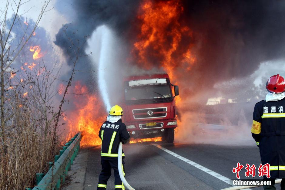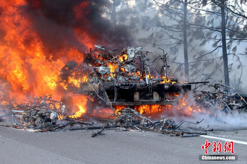 1月23日下午16時(shí)許,滬昆高速公路江西弋陽(yáng)往貴溪方向593公樁(貴溪收費(fèi)站附近)一輛載有133部電動(dòng)車的半掛車起火,導(dǎo)致電動(dòng)車被大火“吞噬”。江西貴溪消防官兵接警后迅速到場(chǎng)撲救,半小時(shí)后將大火撲滅。據(jù)司機(jī)稱,火災(zāi)疑因高速護(hù)坡雜草叢起火產(chǎn)生的火芯飄至半掛車,引燃包裝電動(dòng)車的紙殼箱所致。中新社發(fā) 龔武 攝