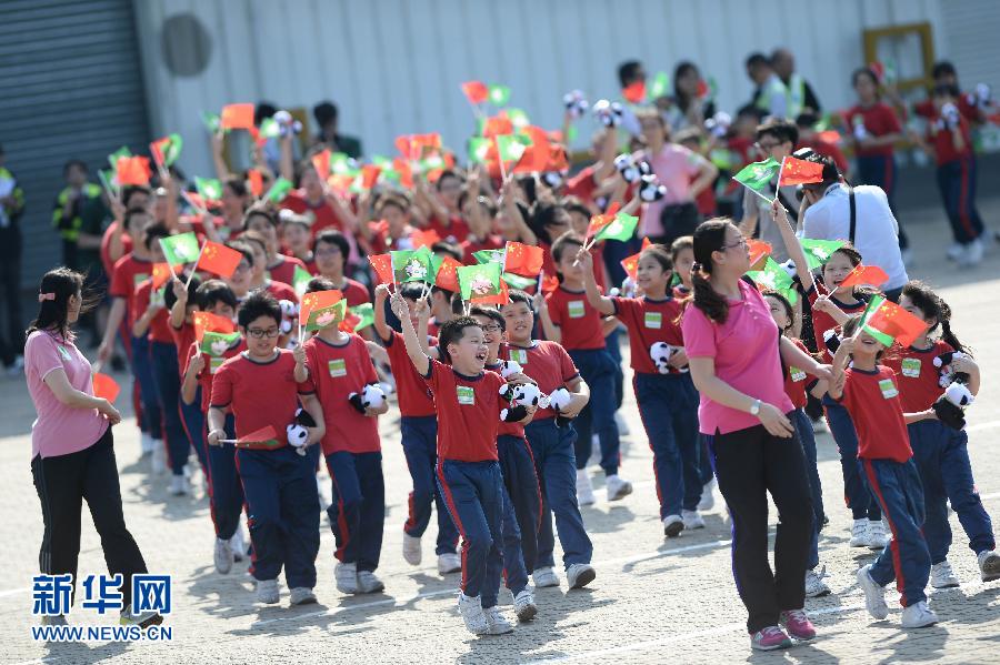 4月30日,孩子們?cè)诎拈T機(jī)場(chǎng)迎接大熊貓。當(dāng)日16時(shí)許,中央政府贈(zèng)送澳門的新一對(duì)大熊貓運(yùn)抵澳門,澳門特區(qū)政府行政法務(wù)司司長(zhǎng)陳海帆等官員及部分少年兒童在機(jī)場(chǎng)迎接。大熊貓經(jīng)檢疫人員檢查后在運(yùn)輸籠中向前來(lái)接機(jī)的人們短暫亮相。目前它們身體狀況良好,隨后將前往金像農(nóng)場(chǎng)進(jìn)行30天隔離檢疫。新華社記者張金加攝