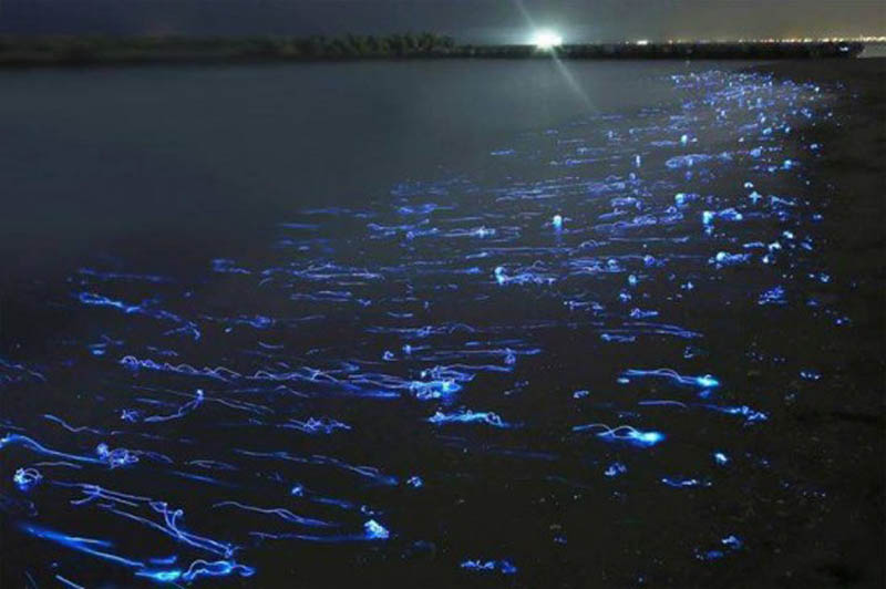 熒光烏賊是海洋中神奇的發(fā)光生物,通常只有7厘米長,具有復(fù)雜的表皮發(fā)光器和眼球發(fā)光器。在日本富山灣海下三四百米深的海溝中棲息著大量熒光烏賊,他們的一生大部分時間生活在海底,每年的3月至6月浮到海面產(chǎn)卵。每年這一時節(jié)的夜晚,聚集在富山灣沿岸的熒光烏賊協(xié)調(diào)一致地發(fā)出藍(lán)光,將整個海岸點(diǎn)亮,如夢如幻,成為富山灣獨(dú)特的風(fēng)景,吸引著眾多游客前來欣賞。