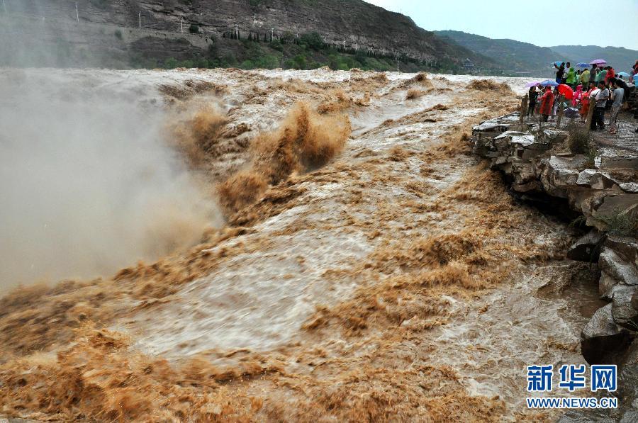 8月2日,游客在山西吉縣黃河壺口瀑布景區(qū)游覽觀瀑。受上游強(qiáng)降雨天氣影響,黃河干流晉陜峽谷水位暴漲,濁流滾滾奔騰而下,使得位于山西吉縣和陜西宜川交界的壺口瀑布瀑面驟然變大,形成400多米寬的特大瀑布群,氣勢(shì)磅礴,蔚為壯觀。新華社發(fā) 呂桂明 攝 圖片來源:新華網(wǎng)