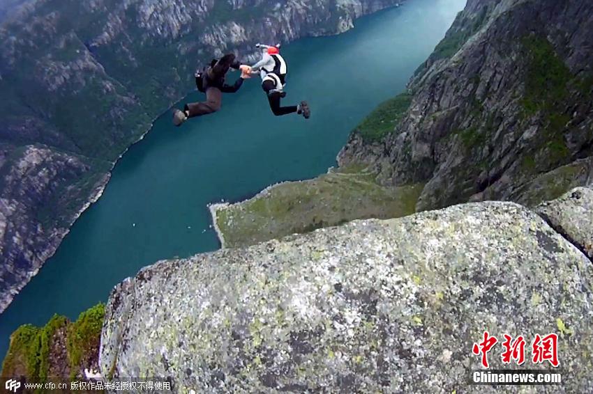 他們二人這種愛意滿滿的跳傘進行過兩次,第一次是在挪威3500英尺(約合1066米)的懸崖往下跳;第二次是今年4月從1358英尺(約合414米)高的迪拜公主塔跳下來。 圖片來源:CFP視覺中國