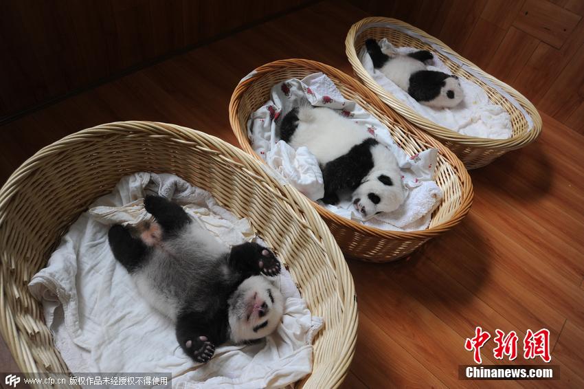 酣睡中的熊貓寶寶們。2015年大熊貓產(chǎn)仔形勢喜人,特別是大熊貓雙胞胎數(shù)量,已經(jīng)達到7對,是研究中心有記錄以來雙胞胎數(shù)量最多的一年。 圖片來源:CFP視覺中國