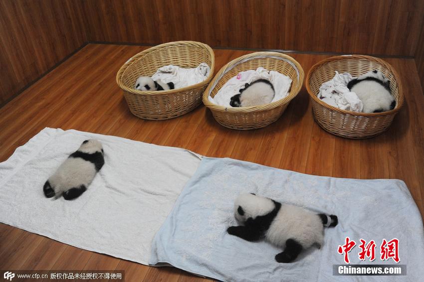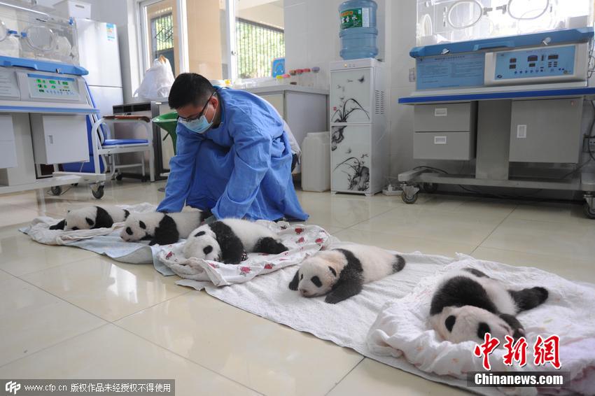 2015年8月21日,四川雅安,中國保護大熊貓研究中心基地內(nèi),今年新生大熊貓寶寶首次亮相。2015年出生的在進行人工育幼的有十只大熊貓寶寶,它們中最大的剛滿兩月,最小的不足一周。 圖片來源:CFP視覺中國