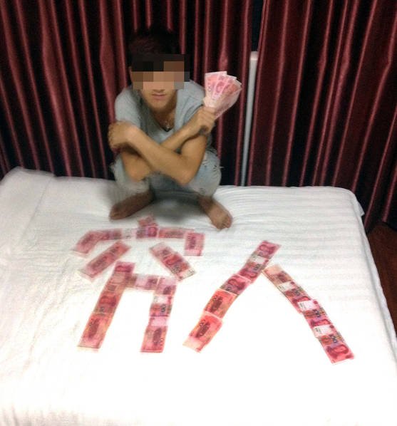 在小偷鄧某隨身帶的手機(jī)里,警察還意外發(fā)現(xiàn)了兩張照片,是一名男子和用100元人民幣擺成的“窮人”、“窮不”的字樣的合影。經(jīng)過民警詢問得知,照片上的男子是鄧某的老鄉(xiāng)唐某,這些錢是他第一次行竊的時(shí)候偷來的,總共有5100元。由于第一次一次性竊得這么多錢,兩人欣喜若狂,在居住的旅店內(nèi)把百元大鈔盡情的“秀”了一把。警方則根據(jù)照片上的線索順藤摸瓜,在廣東將唐某逮捕。