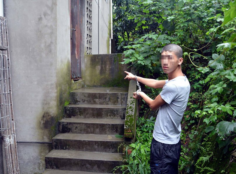 陳警官介紹,鄧和唐都是重慶市榮昌縣人,父母都在外地打工,因和家里有矛盾,唐某帶著1000元錢和鄧某回到了重慶,本來準(zhǔn)備找份工作,但1000元很快花完了,也沒有找到像樣的工作,于是就起了賊心。鄧某和唐某第一次偷盜的金額就有5100元,對(duì)他們來講已經(jīng)算是巨資,所以才想著拍照“留念”。圖為唐某指認(rèn)現(xiàn)場(chǎng)。