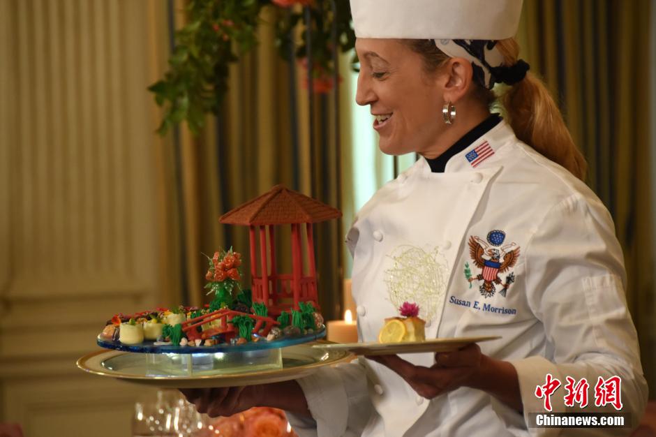 白宮首席甜點師莫里森展示為此次國宴準(zhǔn)備的甜點。 中新社記者 刁海洋攝