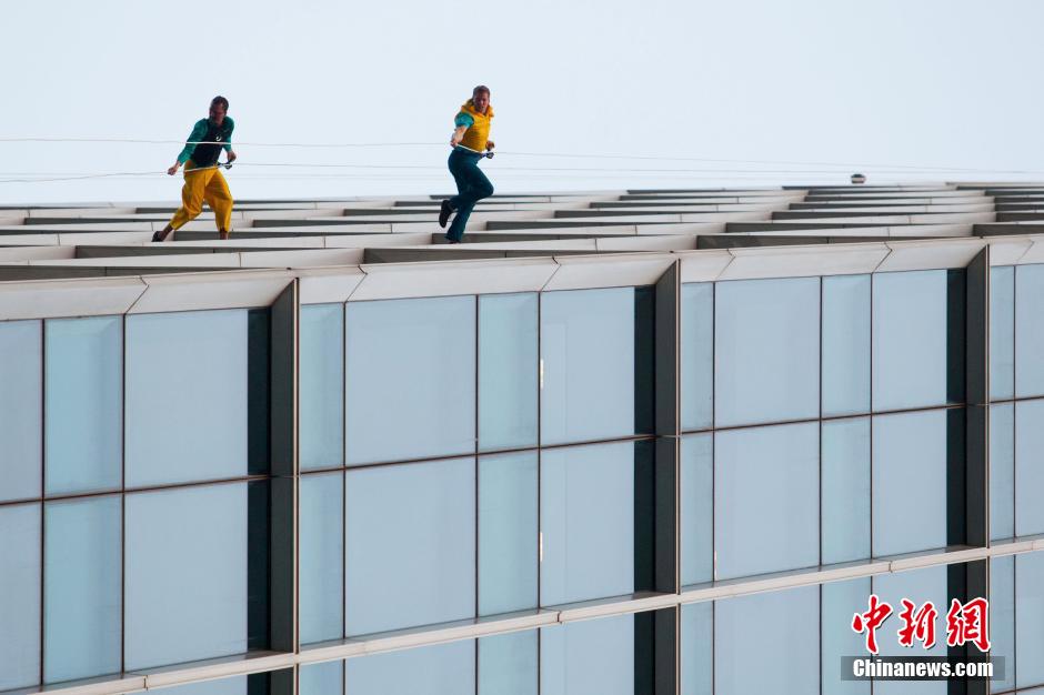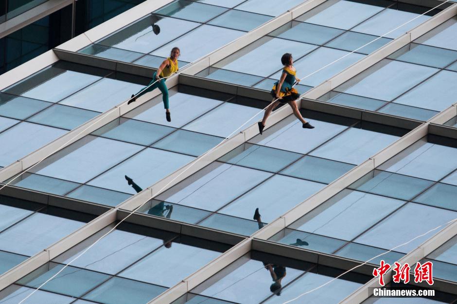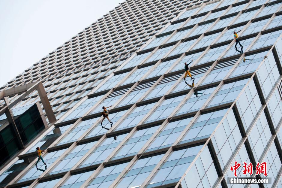 10月15日,美國BANDALOOP高空舞蹈團(tuán)“空中芭蕾”中國內(nèi)地首秀空降上海街頭,4名高空舞者在80米高的玻璃幕墻上翩翩起舞,舞蹈之美和力量之美在云端融合。中新社記者 張亨偉 攝