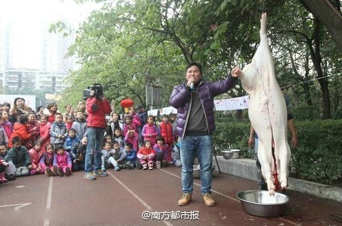 12月24日下午,重慶玉帶山小學(xué)舉行“民俗文化代代傳 傳統(tǒng)文化進(jìn)校園”活動(dòng)。學(xué)校從鄉(xiāng)下買回兩頭年豬,請(qǐng)來(lái)村民講述年豬習(xí)俗,殺豬匠殺豬后,科學(xué)老師為學(xué)生講解年豬身體結(jié)構(gòu)。