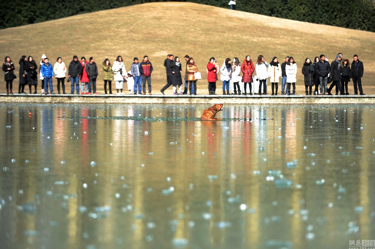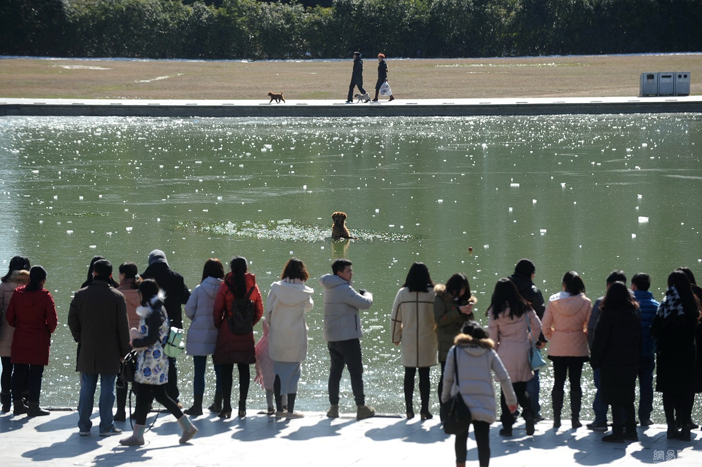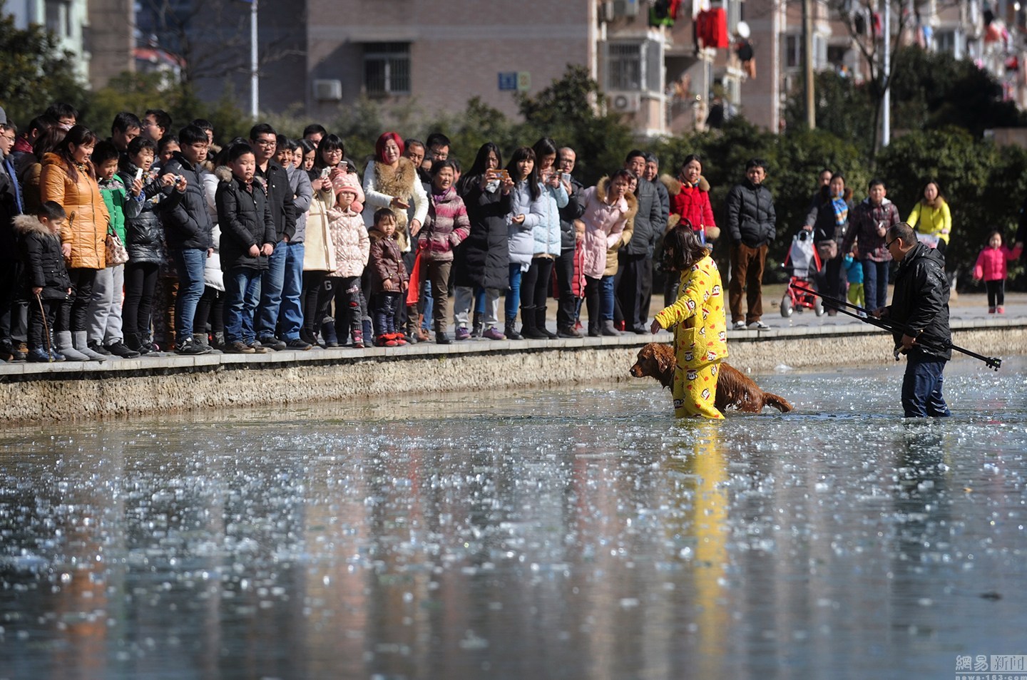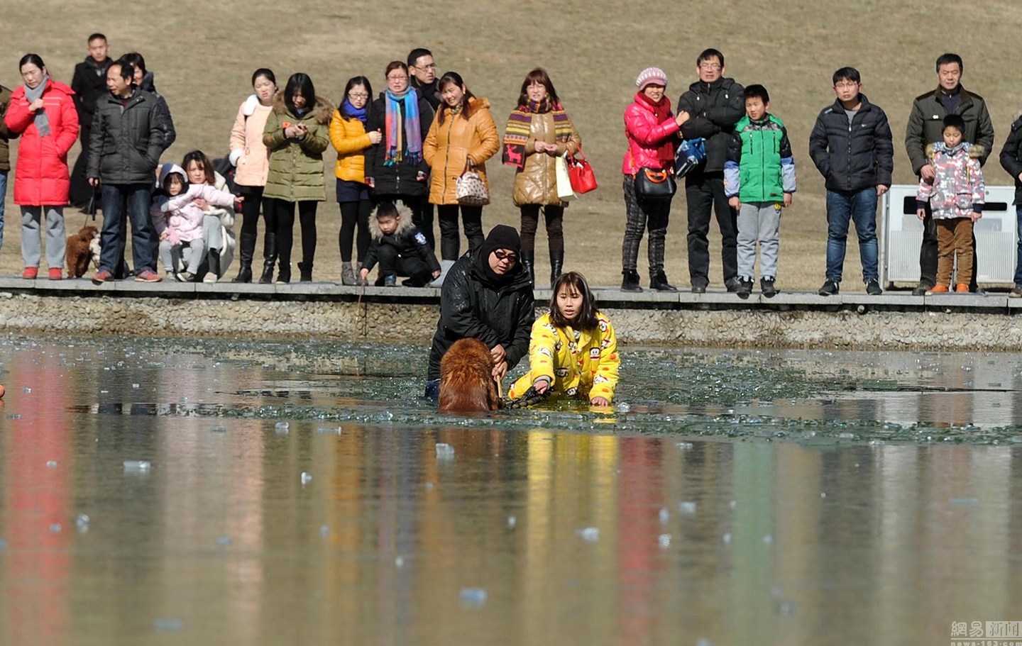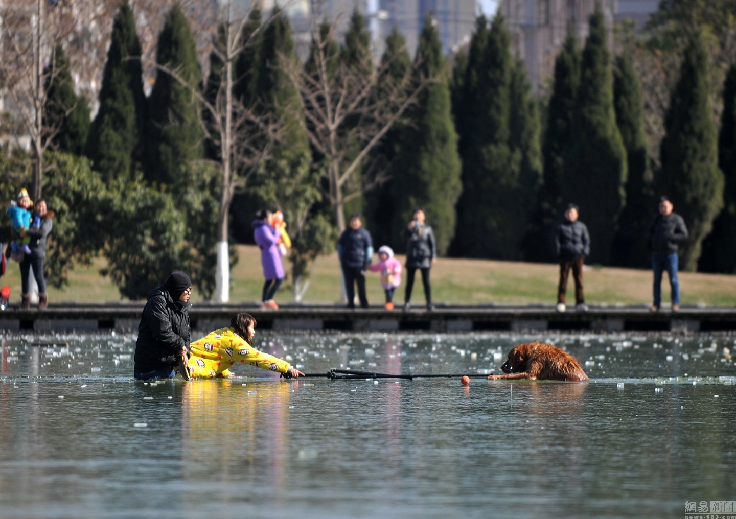“狗狗主人一直告訴它要用力。”項先生說大金毛雖然奮力掙扎,卻無濟于事,越掙扎陷得越深,體力也消耗了不少。一旁的狗主人很是著急,決定下水救它,無奈女同志體力有限,基本破不了冰。不忍看著一個生命就這樣消失。圖為眾人圍觀被困冰窟的金毛。