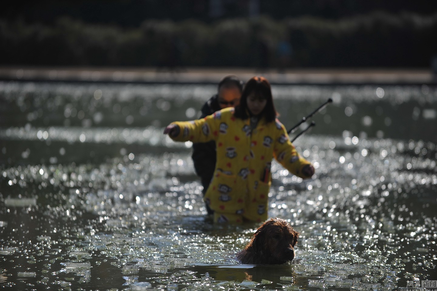 “我知道這水不深,自己又會游泳?!泵鎸Ρ涞乃?,項先生并沒有多想,只想趕緊救出狗狗。圖為兩人合力救金毛現(xiàn)場。