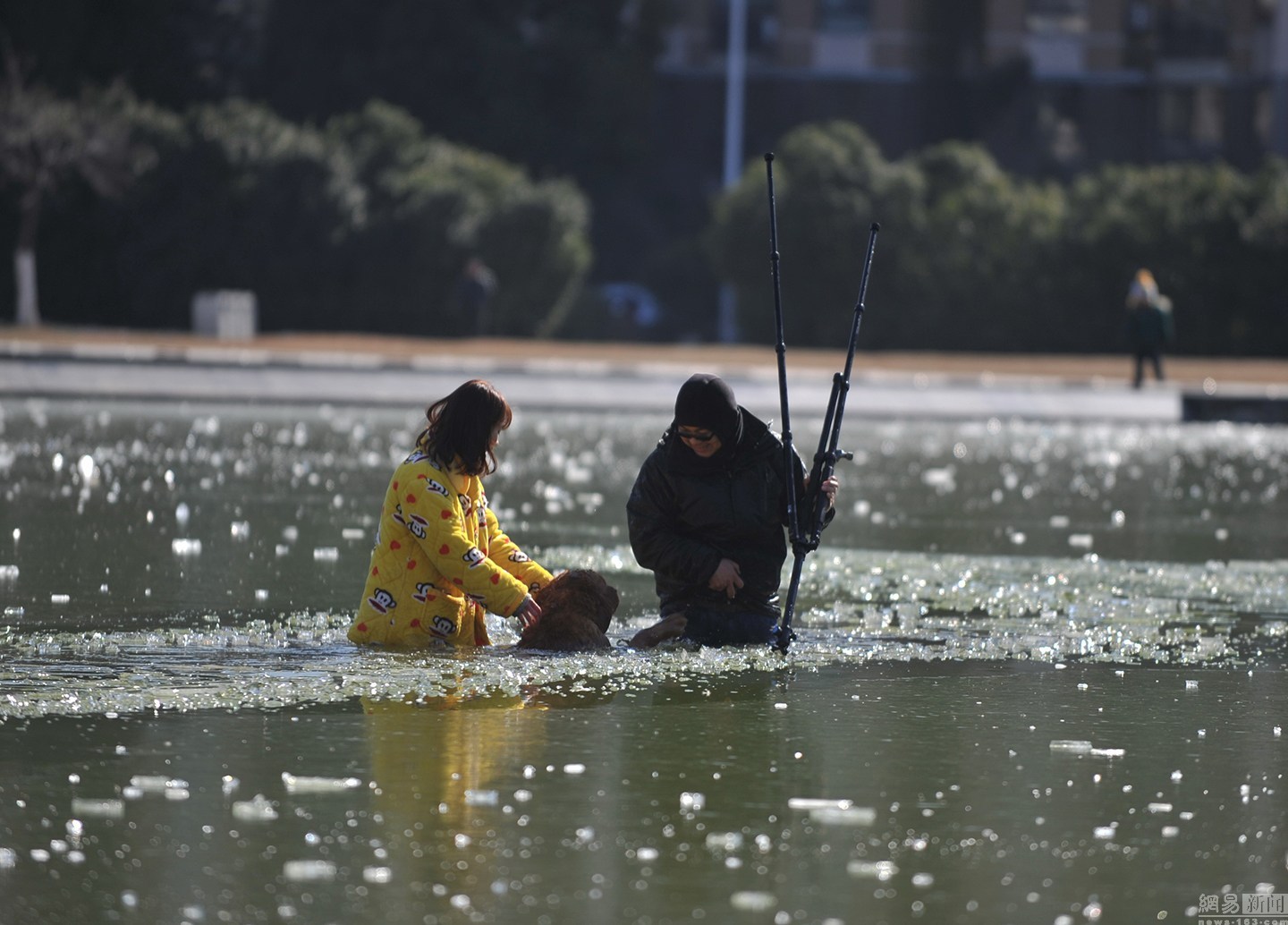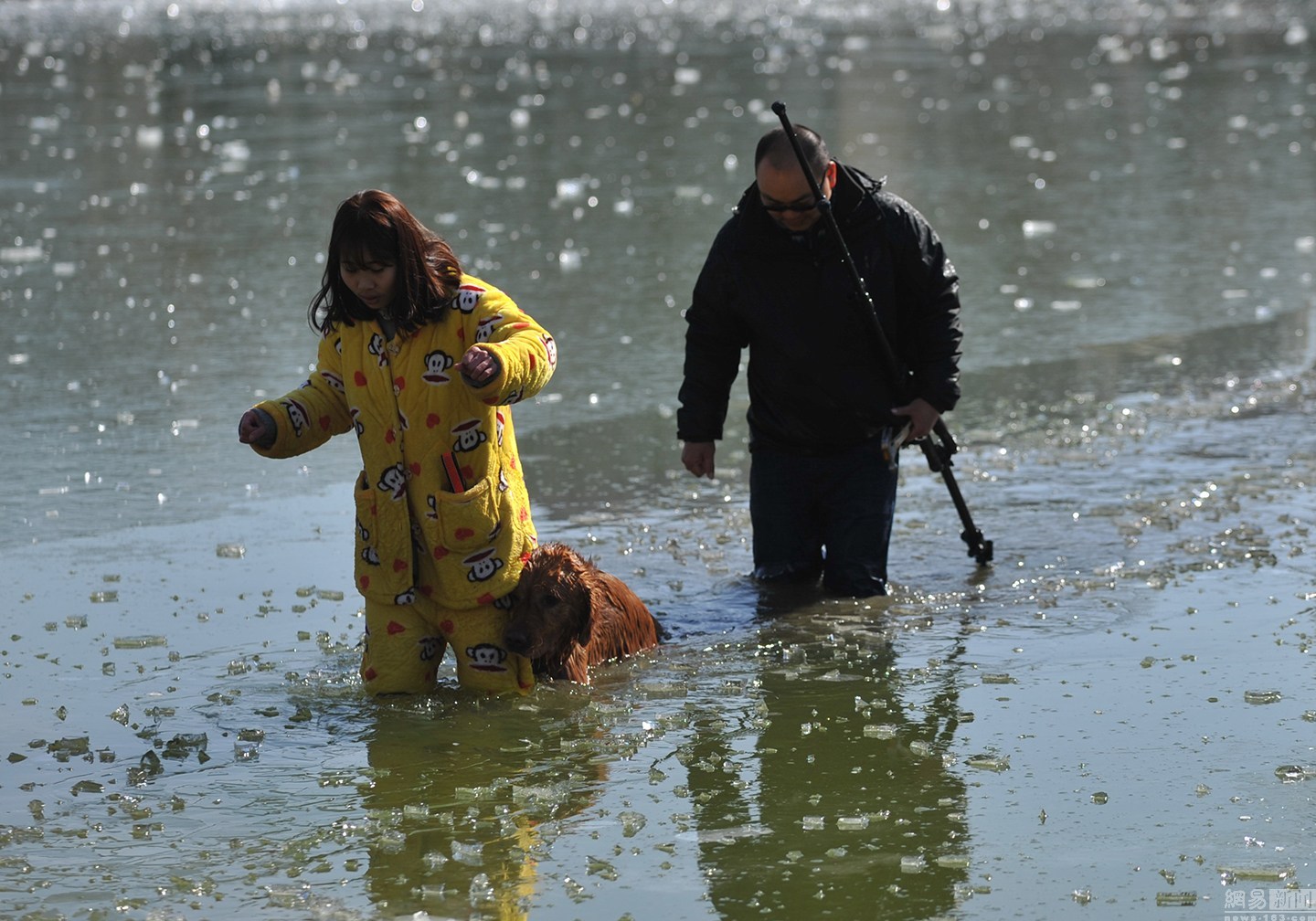 項先生當(dāng)即放下手中的活,拿起拍攝使用的三腳架,直接走進冰冷的湖水,敲碎河面上的冰,朝狗狗走去。最后金毛犬獲救。圖為項先生用三腳架破冰下水救金毛。