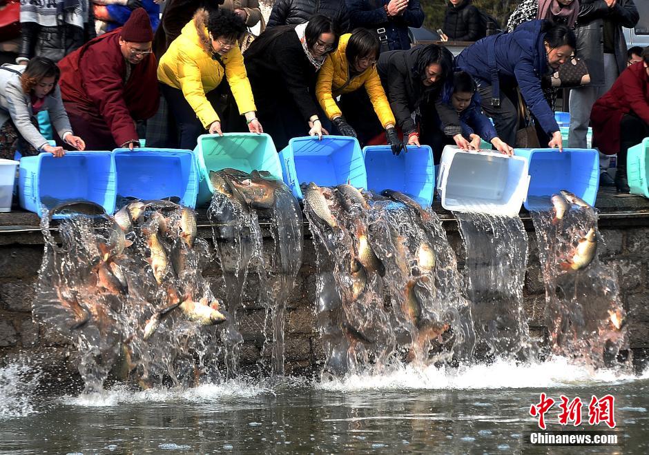 2016年2月22日,山東省濟南市,眾多市民來到大明湖南岸,以每斤4.5元的價格購買鯉魚和鯽魚,集體將魚兒放生到大明湖,千余尾魚兒同時傾倒在湖中,場面頗為壯觀。