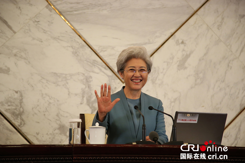 3月4日,全國人大發(fā)言人傅瑩面對記者揮手致意。