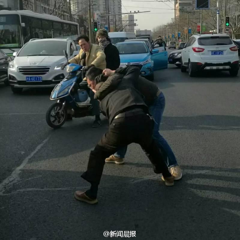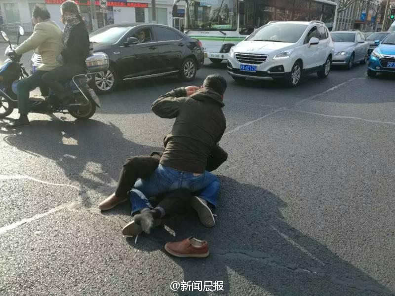 晨報(bào)訊 你一個(gè)過肩摔,我一個(gè)橫掃腿,接著扭打在一起,互相纏斗難分伯仲……這幕刺激的武打動(dòng)作場景,昨天早高峰時(shí)在上海安波路營口路上演,而沖突竟源于“路怒”!目擊者肖先生告訴記者,昨天上午8點(diǎn)不到,他經(jīng)過安波路、營口路路口時(shí),看看兩名男子扭打在一起,場面十分激烈?!拔翼槃菽贸鍪謾C(jī)拍了幾張照片,旁邊也有行人上去勸架?!毙は壬f,在兩名男子的身旁,一橫一豎停著兩輛轎車,“我想可能是兩個(gè)人開車有點(diǎn)摩擦引起的‘路怒’吧?!?/font>