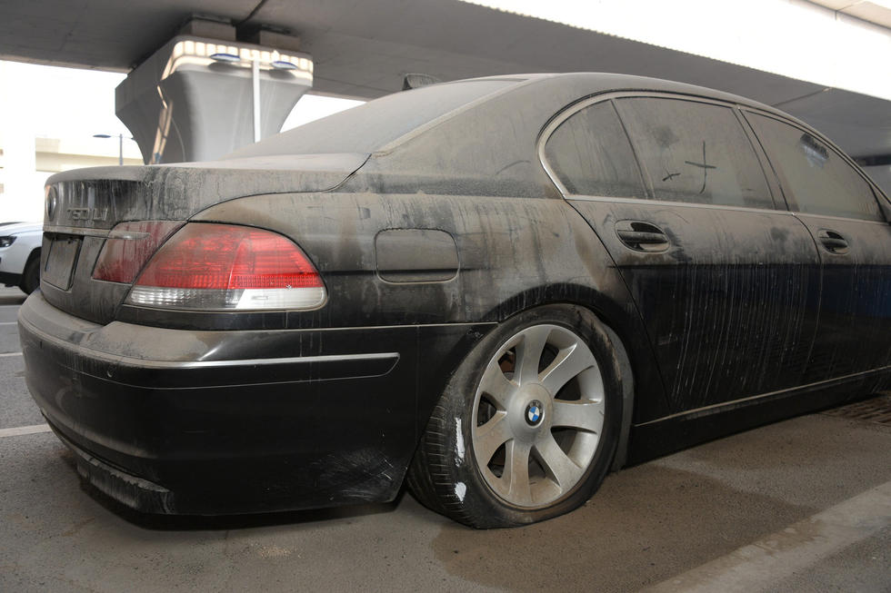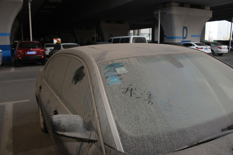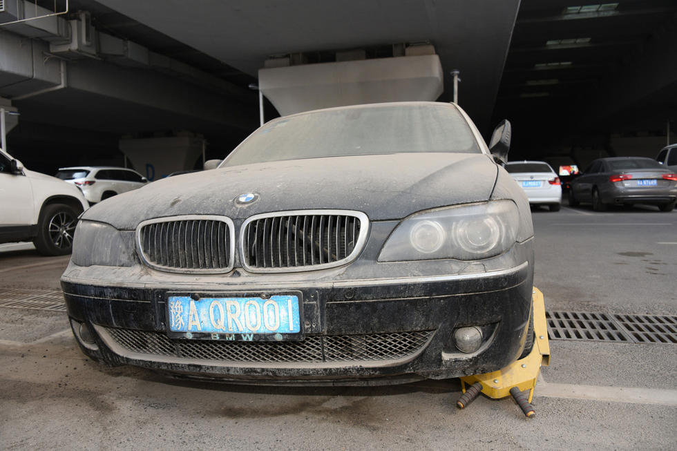 上午7時30分,中興路附近的高鐵站北區(qū)停車場,在入口處東側(cè),這輛“蓬頭垢面”的寶馬車車全身落滿了塵土,已呈灰色。其實,這是一輛價值過百萬的黑色寶馬750LI。該車的右前后輪已經(jīng)癟了,左前輪被上了鎖。在車后備箱左側(cè)上方有一處凹陷,但不太明顯。后引擎蓋上被人寫上“下雨了”字樣。車的縫隙處堆積著厚厚的塵土,顯然,這輛寶馬車已經(jīng)在此停放已經(jīng)有很長時間了。