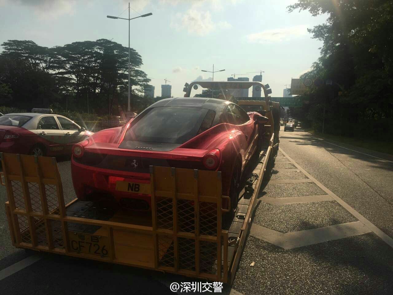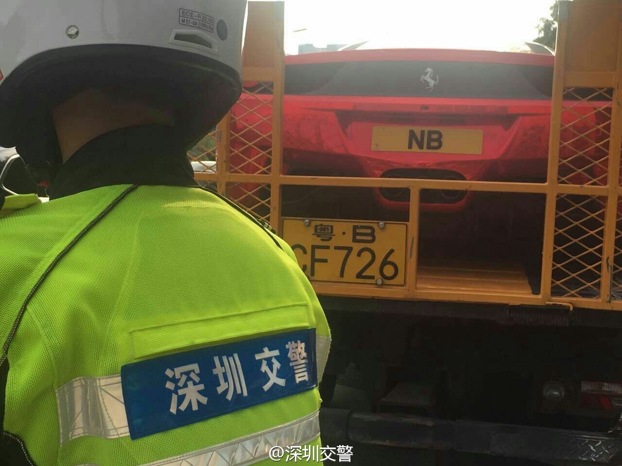深圳交警5月7日17:16發(fā)布了一條微博:“當(dāng)鐵騎遇到他……”,同時(shí)配上四張圖片:只見一輛掛著“NB”車牌的紅色跑車被交警鐵騎攔下,最后被帶走。
