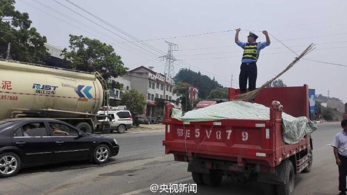 交警董金橋手托線纜。 央視記者 魏軼 圖片來源:央視新聞官方微博