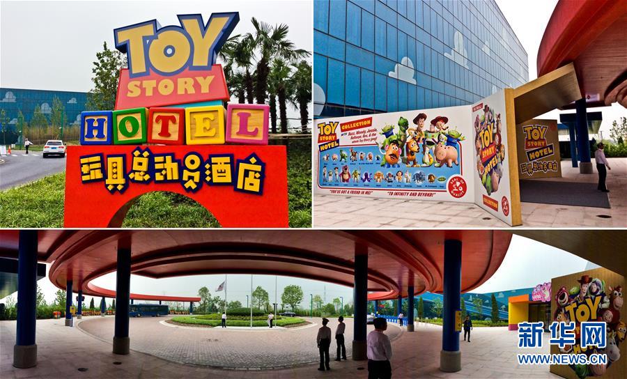 5月15日拍攝的上海迪士尼玩具總動(dòng)員酒店入口標(biāo)志(左上)、酒店大門(右上)和酒店大堂(下)(拼版圖片)。當(dāng)日,上海迪士尼主題酒店之——玩具總動(dòng)員酒店大堂、廣場(chǎng)、餐廳、度假區(qū)短駁車等區(qū)域及設(shè)施開(kāi)始內(nèi)部測(cè)試。這家共有800個(gè)房間的主題酒店將于6月中旬正式迎客。新華社發(fā)(鈕一新 攝)