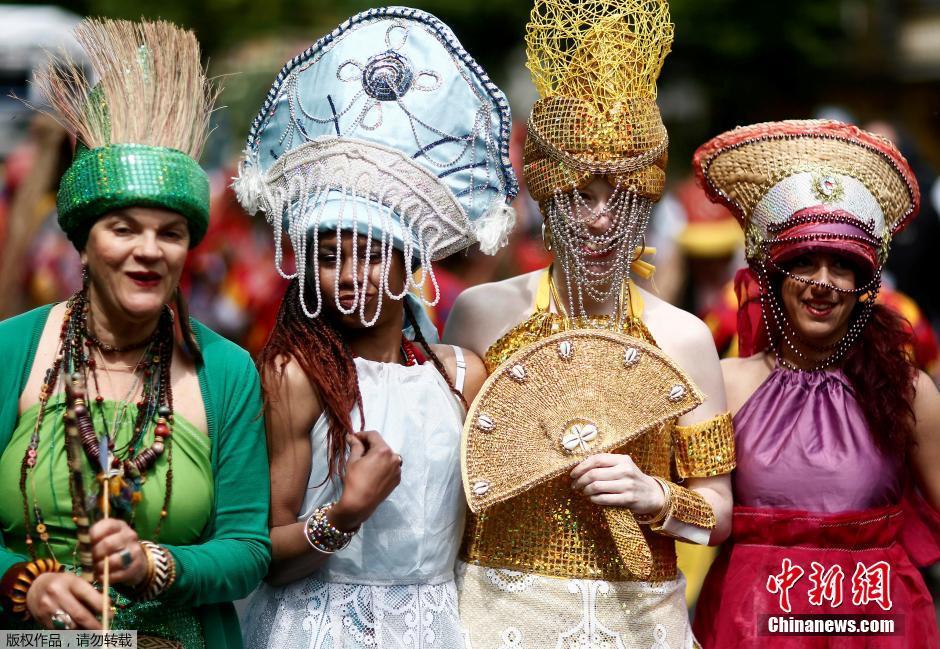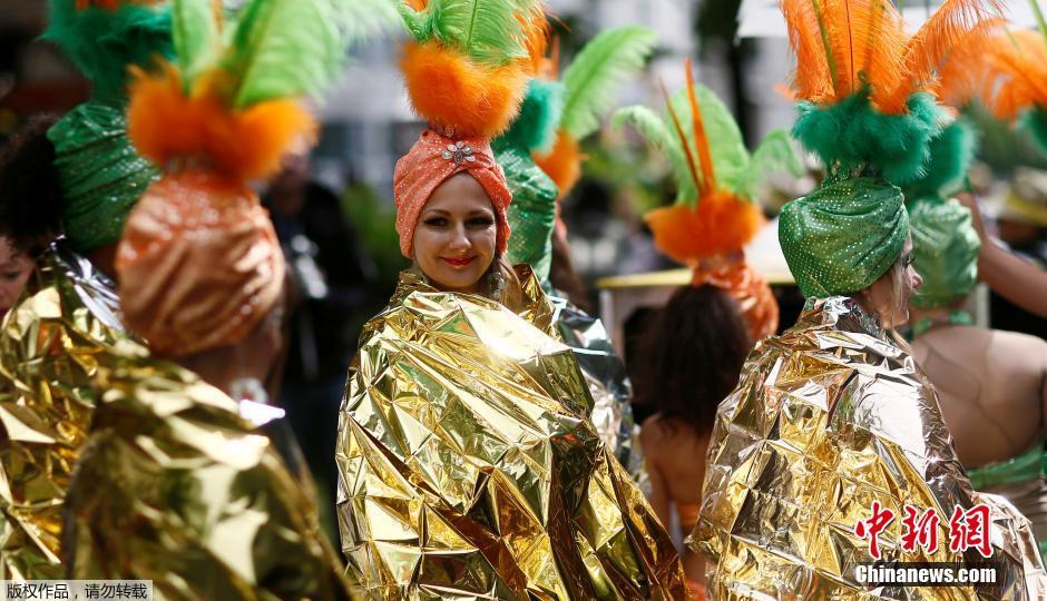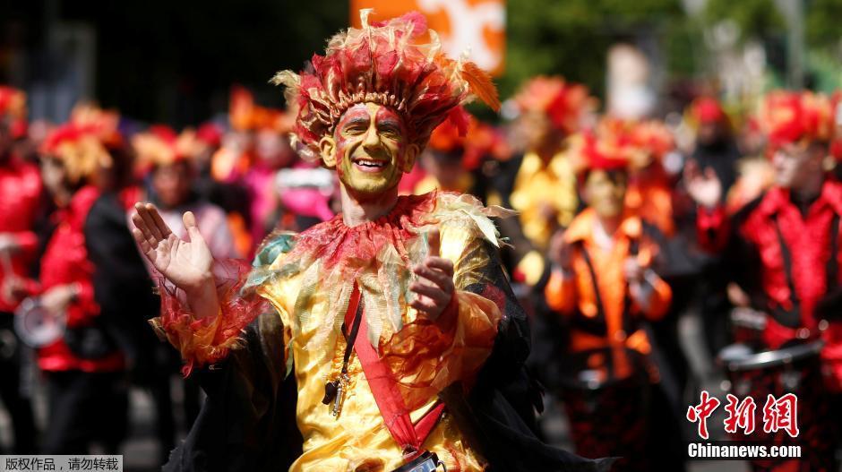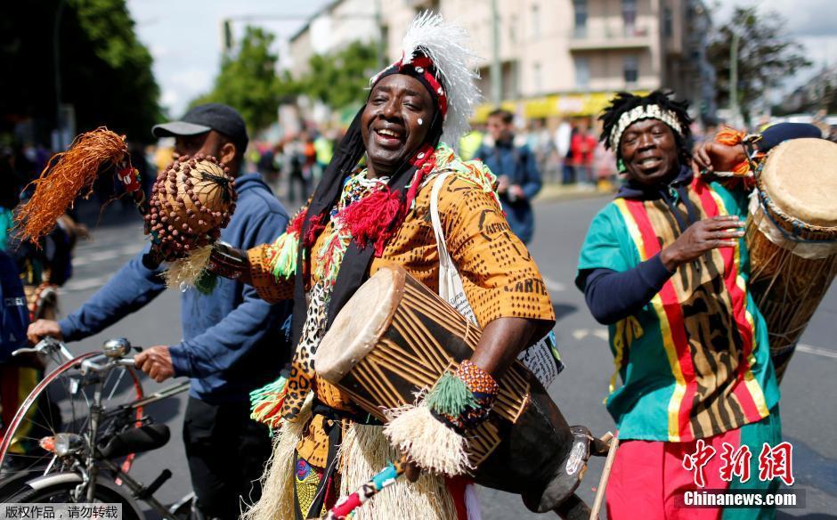 當?shù)貢r間5月15日,德國柏林,當?shù)孛癖娚碇厣椩诎亓治幕駳g節(jié)上參加游行。當日,柏林舉辦文化狂歡節(jié)大游行,數(shù)千名來自世界各地的狂歡者加入。