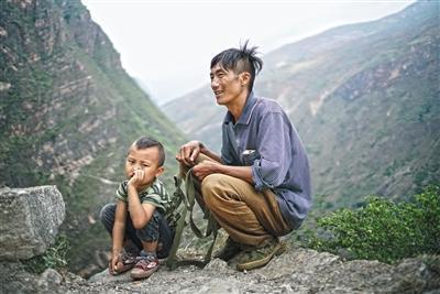 圖為5月12日晚上,村民坐在玉米稈上搜尋手機(jī)信號(hào),村里沒(méi)有發(fā)射塔,全靠山下發(fā)射到的微弱信號(hào)接收手機(jī)短信和打電話。9點(diǎn)多鐘,勒爾小學(xué)校長(zhǎng)吉克拉者帶著15個(gè)孩子到山下,其中有陳古吉的5個(gè)孩子,4個(gè)女孩1個(gè)男孩,最小的男孩叫陳木黑,6歲,讀學(xué)前班。爬山開始前,陳木黑被陳古吉系上背包繩。前面由一個(gè)家長(zhǎng)引路,中間一個(gè)家長(zhǎng),陳古吉帶著陳木黑走最后,6歲的陳木黑已經(jīng)在這條路上,上上下下幾十次了。在爬垂直藤梯的時(shí)候,陳古吉會(huì)從后面微微提繩,讓兒子能夠省點(diǎn)力氣,跟上前面的哥哥姐姐。在通過(guò)沒(méi)有任何附著物的崖壁上的道路時(shí),陳古吉就格外小心,緊抓繩子的手有時(shí)青筋暴起。他說(shuō),前些日子,一個(gè)娃滑了一下,幸好崖邊的藤條擋住了,才撿回一條命。
