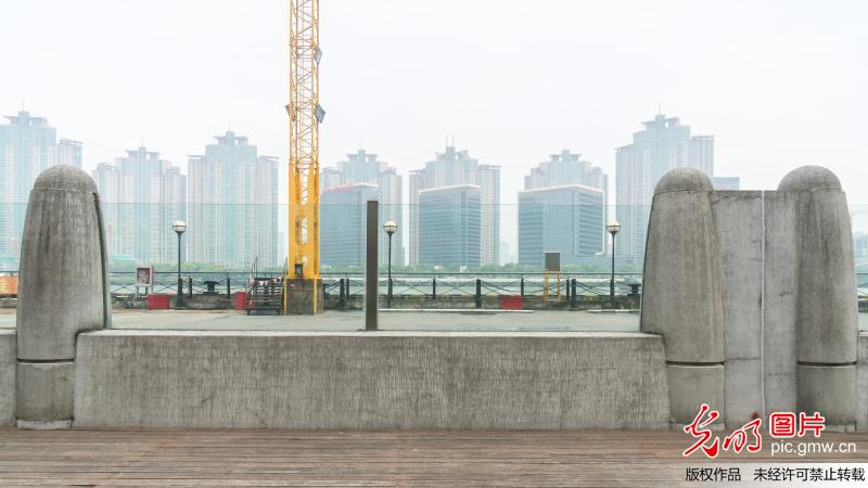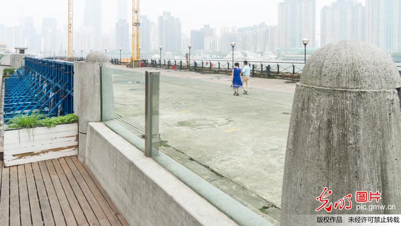 當(dāng)日中午,走訪(fǎng)南外灘老碼頭,見(jiàn)到這一長(zhǎng)達(dá)數(shù)十米,由鋼筋混凝土墻體和通透式玻璃組合而成的"抗洪神器",其中雙層玻璃防汛墻的厚度達(dá)到18毫米,既滿(mǎn)足防汛擋水需要,同時(shí)方便游客坐在岸堤邊欣賞老碼頭和江岸景色。(王岡攝/光明圖片)
