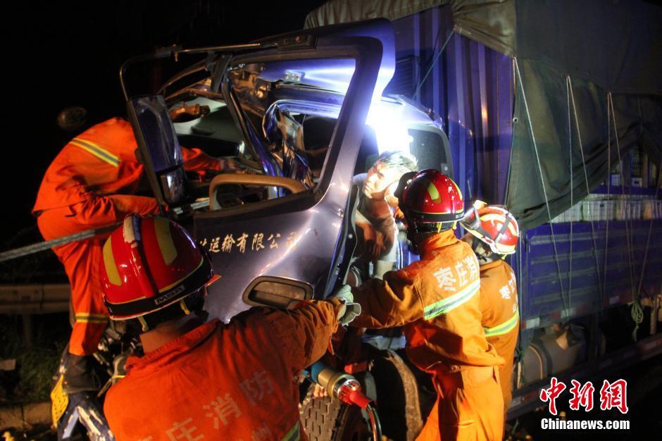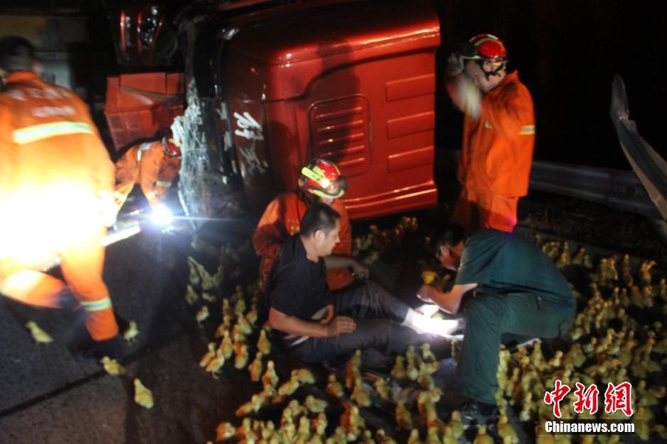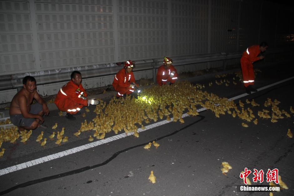 7月26日凌晨,在京臺高速滕北出口往南路段發(fā)生一起車禍,一輛裝滿鴨苗的廂貨車與半掛車發(fā)生追尾,車上3人被困,數(shù)千只鴨苗散落在高速路上。山東省棗莊市滕州消防大隊接到報警后迅速出動,對高速路面上的鴨苗進行了驅趕,疏通高速交通,及時營救出車上被困人員。中新社發(fā) 季龍 攝 圖片來源:CNSPHOTO
