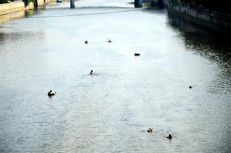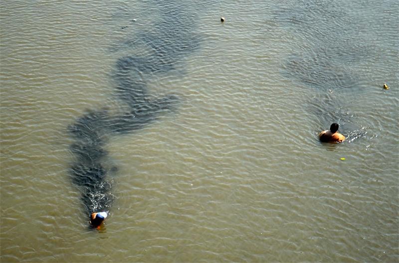 22日,在濟(jì)濼橋下的小清河,10多名男子整個身體浸泡在水中,只有頭部露出水面。