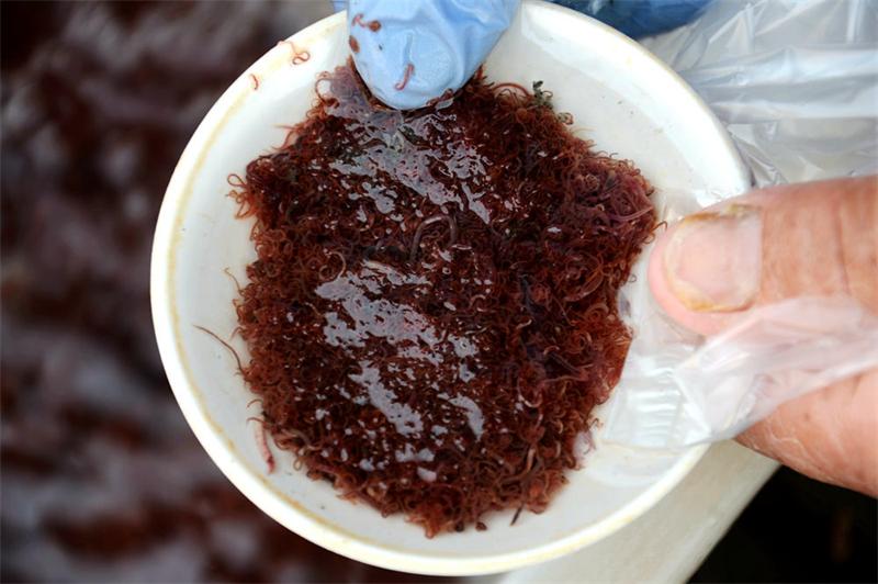仔細(xì)觀察才發(fā)現(xiàn)男子們都身穿連體防水衣,在蹲在發(fā)臭的河水中,將網(wǎng)撒到河底后左右攪拌,河底的淤泥被攪了上來,河水立刻變得非常渾濁,搖晃漁網(wǎng)篩去淤泥后,把剩下的紅線蟲倒入塑料袋中。