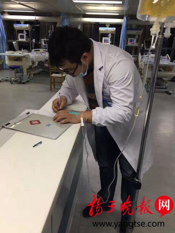 10月29日,一位身穿白大褂帶著口罩的男醫(yī)生,一邊打點滴,一邊為病人下醫(yī)囑的照片,出現(xiàn)在記者的微信朋友圈中。記者獲悉,這位醫(yī)生是江蘇鹽城市濱??h人民醫(yī)院的一名醫(yī)師,當時正在搶救病人,現(xiàn)場非常感人。圖片來源:揚子晚報網(wǎng)
