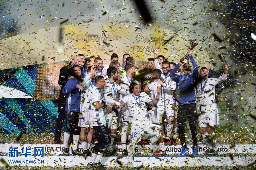 12月18日,皇家馬德里隊(duì)球員在世俱杯頒獎(jiǎng)儀式上歡呼慶祝。新華社記者馬平攝
