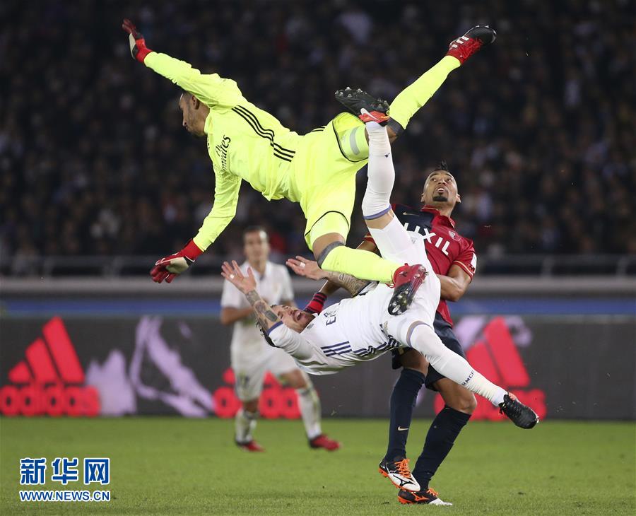 12月18日,皇家馬德里隊(duì)球員拉莫斯(下)、守門員納瓦斯與鹿島鹿角隊(duì)球員法布里西奧拼搶時(shí)撞在一起。新華社/美聯(lián)