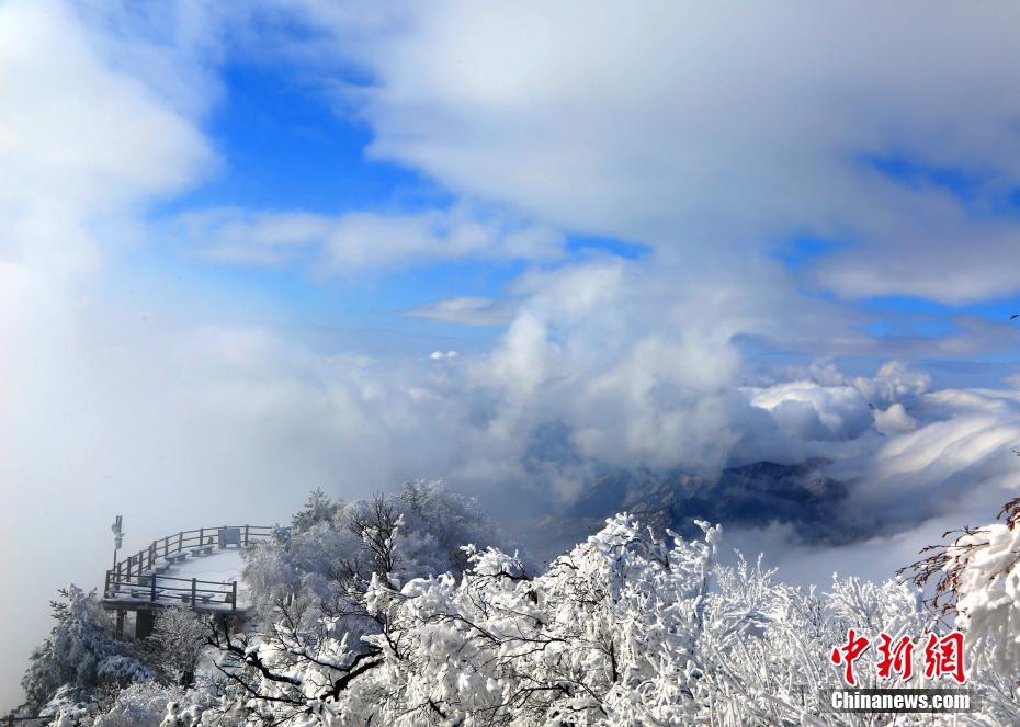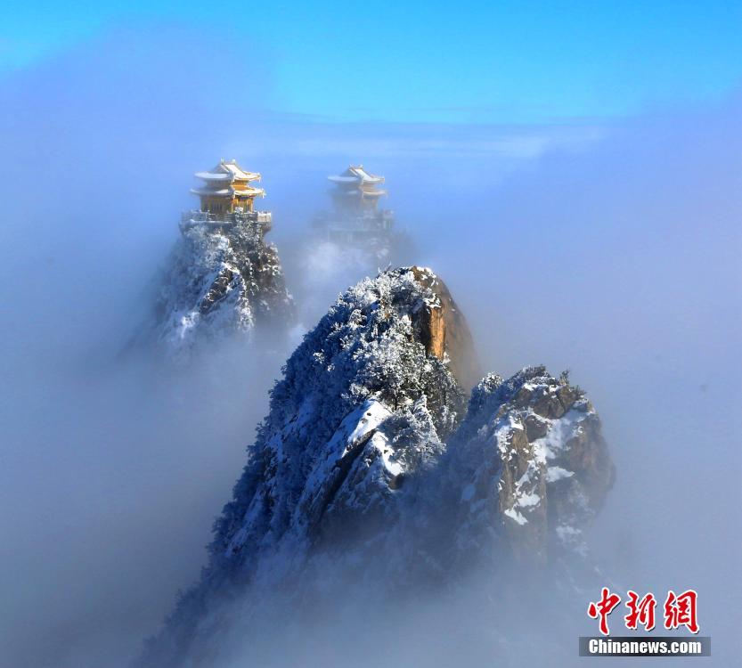 1月7日,連續(xù)降雪之后,位于河南洛陽的道教圣地老君山雪后初晴,海拔2000米的伏牛山主峰上,白雪皚皚、銀裝素裹,加之云海浮現(xiàn)與藍天白云交相輝映,絕壁道觀似瓊樓玉宇幻如仙境美不勝收。王中舉 攝