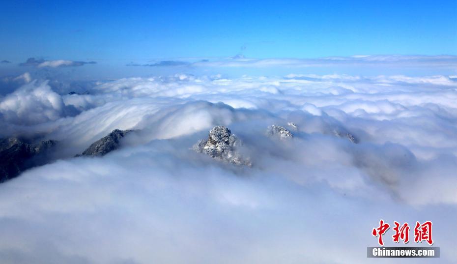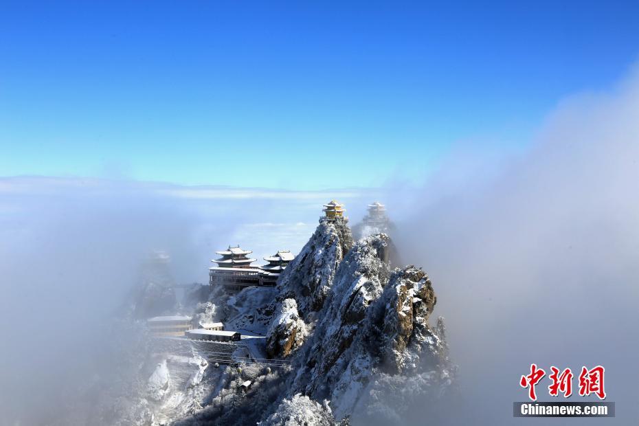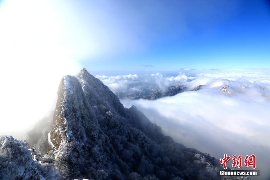 1月7日,連續(xù)降雪之后,位于河南洛陽的道教圣地老君山雪后初晴,海拔2000米的伏牛山主峰上,白雪皚皚、銀裝素裹,加之云海浮現(xiàn)與藍天白云交相輝映,絕壁道觀似瓊樓玉宇幻如仙境美不勝收。圖為云海波濤洶涌,“淹沒”山頂。王中舉 攝