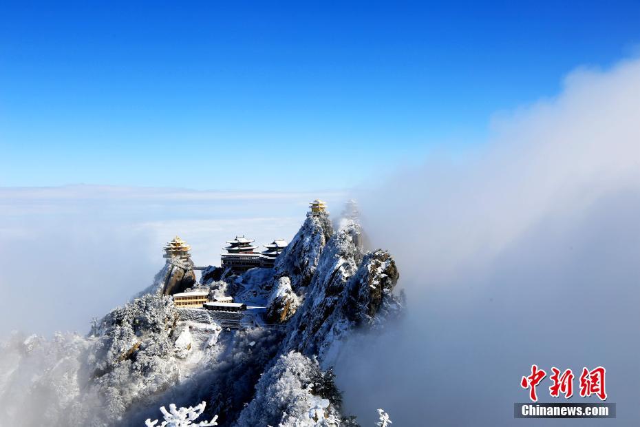 1月7日,連續(xù)降雪之后,位于河南洛陽的道教圣地老君山雪后初晴,海拔2000米的伏牛山主峰上,白雪皚皚、銀裝素裹,加之云海浮現(xiàn)與藍天白云交相輝映,絕壁道觀似瓊樓玉宇幻如仙境美不勝收。 圖為海拔2000米的絕壁道觀幻如仙境。王中舉 攝