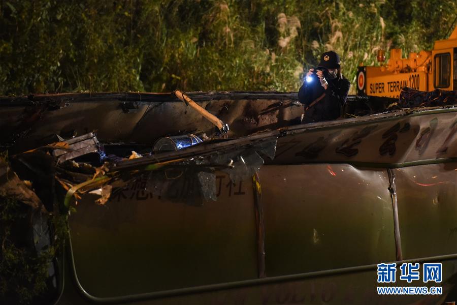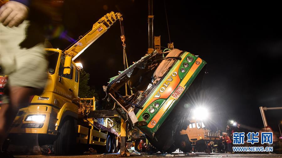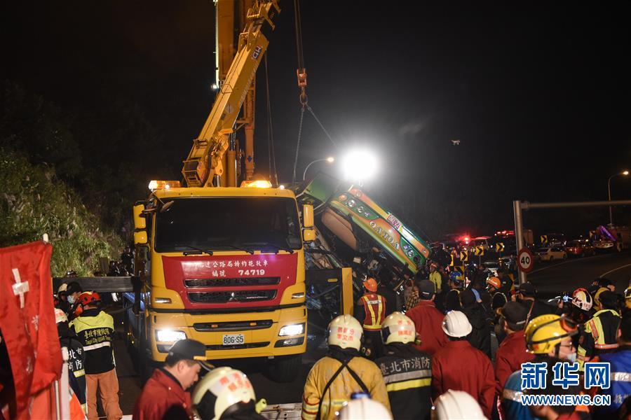 2月14日,事故車輛車體被吊車扶正。據(jù)臺(tái)灣消防部門2月14日零時(shí)許發(fā)布的消息,13日晚發(fā)生的翻車事故已造成32人死亡,受傷的12人已全數(shù)送醫(yī)。新華社記者從臺(tái)灣公路警察部門獲悉,游覽車上沒(méi)有大陸游客。臺(tái)北市消防局通報(bào),13日21時(shí)6分許,在臺(tái)灣公路主干道5號(hào)南港系統(tǒng)交流道接3號(hào)南下路段,臺(tái)北市蝶戀花公司一輛游覽車翻覆于引道邊坡,車內(nèi)共44人(游客42人,導(dǎo)游、司機(jī)各1人),其中死亡32人(30人未送醫(yī),2人送醫(yī)后不治),12人送醫(yī)持續(xù)治療中。新華社記者 歐東衢 攝