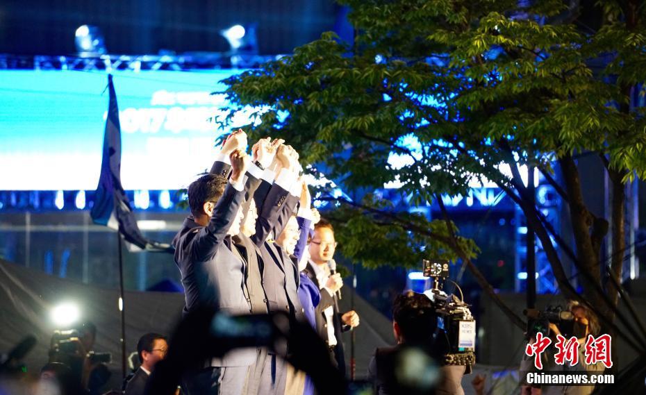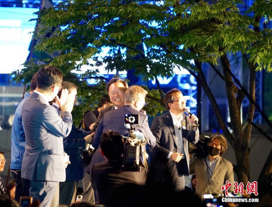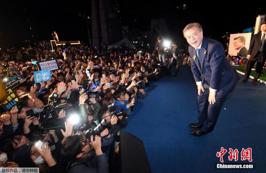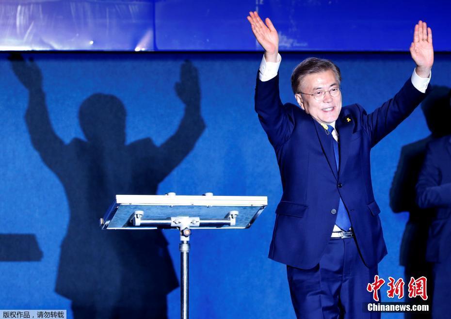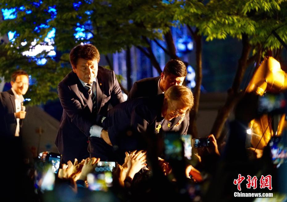 當?shù)貢r間5月9日深夜,韓國第19屆總統(tǒng)選舉共同民主黨候選人文在寅及其競選團隊現(xiàn)身首爾光化門廣場,發(fā)表“勝選演說”,與支持民眾握手慶祝。據(jù)出口民調(diào)顯示,文在寅在當日進行的大選投票中以41.4%的支持率絕對優(yōu)勢勝選。在選舉管理委員會公布的大部分開票結(jié)果中,文在寅得票率也遙遙領(lǐng)先,提前鎖定勝局。 中新社記者 吳旭 攝