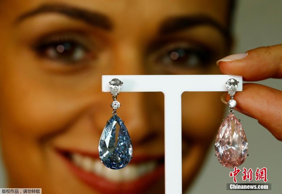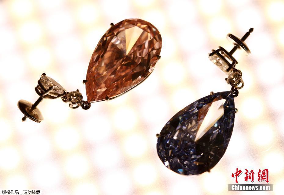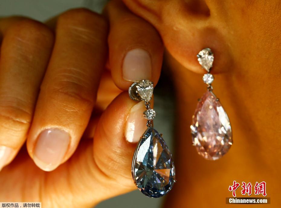 當(dāng)?shù)貢r(shí)間2017年5月11日,瑞士日內(nèi)瓦,14.54克拉的“阿波羅藍(lán)”和16克拉的“阿耳特彌斯粉”鉆石耳環(huán)即將在蘇富比拍賣(mài)行拍賣(mài),估價(jià)分別為3800-5000萬(wàn)美元和1250-1800萬(wàn)美元。