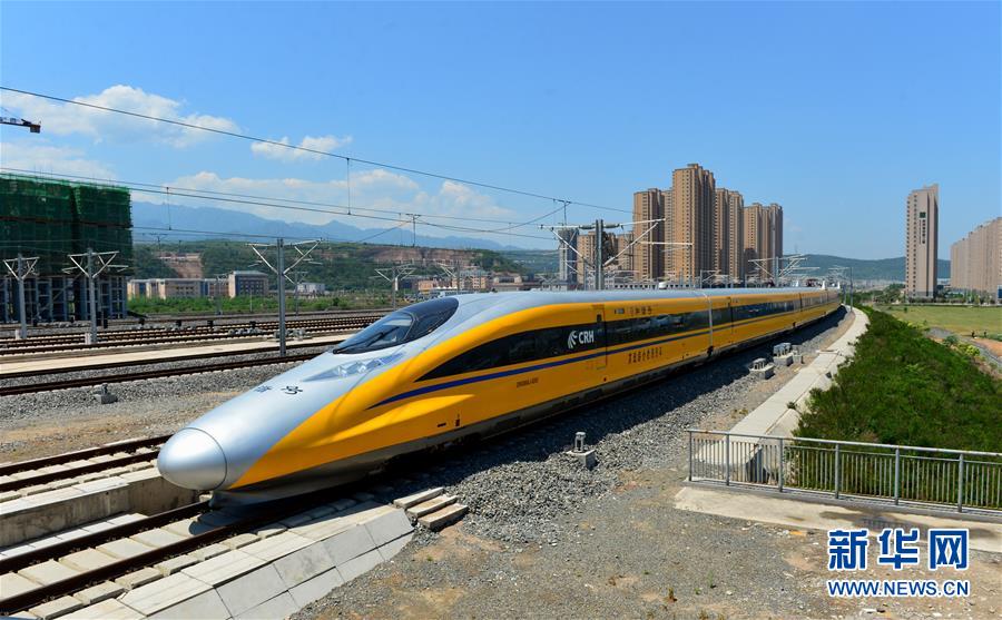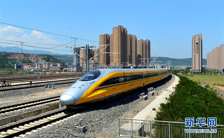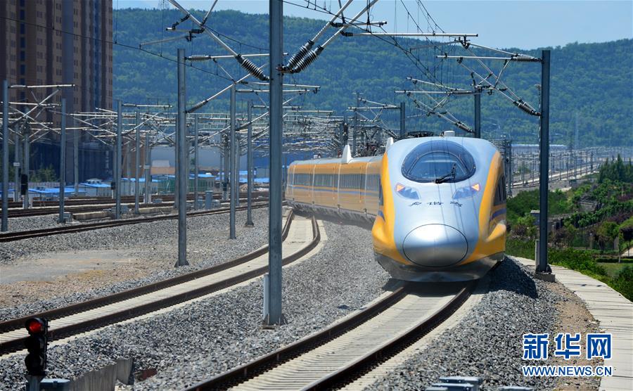 在陜西寶雞,一列高速綜合檢測(cè)列車(chē)在寶蘭高鐵上行駛(5月16日攝)。