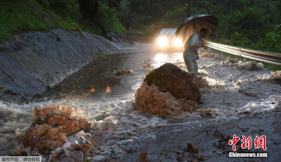 當(dāng)?shù)貢r間2017年7月5日,臺風(fēng)“南瑪都”為日本九州地區(qū)帶來強降雨。圖為九州島大分縣,大雨導(dǎo)致巨石滾落,交通癱瘓。