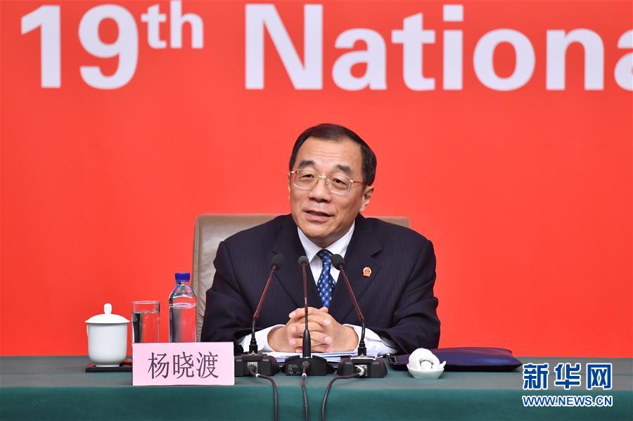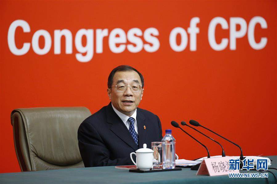 10月19日,中國共產(chǎn)黨第十九次全國代表大會(huì)新聞中心舉行記者招待會(huì),請(qǐng)中共中央紀(jì)律檢查委員會(huì)副書記、監(jiān)察部部長、國家預(yù)防腐敗局局長楊曉渡,中共中央組織部副部長齊玉介紹加強(qiáng)黨建工作和全面從嚴(yán)治黨情況,并回答記者提問。這是楊曉渡在介紹情況。新華社記者 李鑫 攝