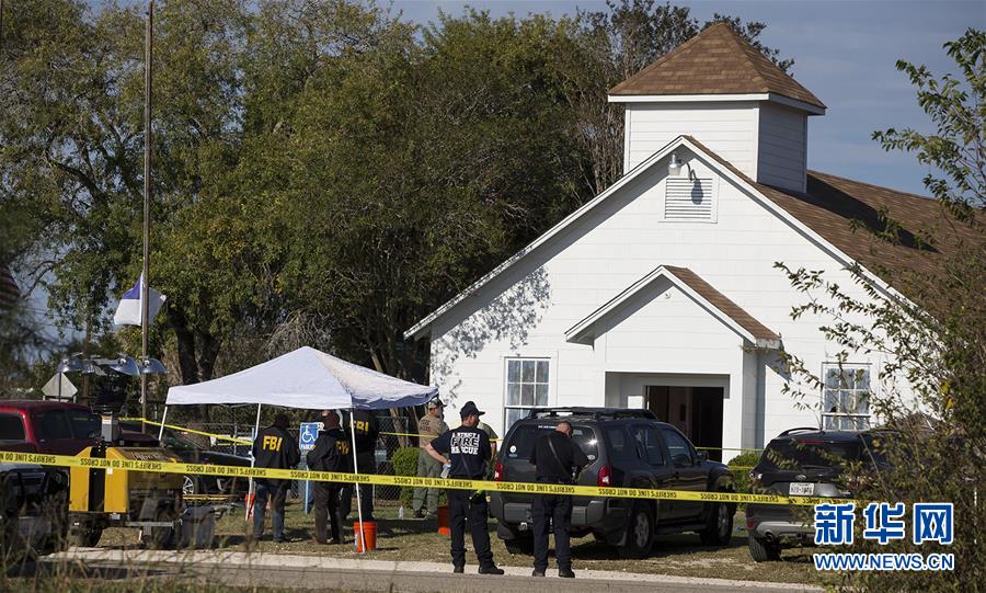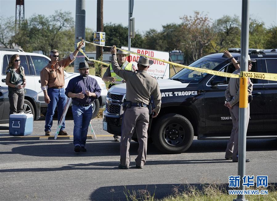 11月5日,在美國得克薩斯州南部薩瑟蘭斯普林斯鎮(zhèn),執(zhí)法人員在槍擊事件現(xiàn)場附近拉起警戒線。美國得克薩斯州南部薩瑟蘭斯普林斯鎮(zhèn)一所教堂5日發(fā)生槍擊事件。警方向當(dāng)?shù)孛襟w證實(shí),槍擊至少造成27人死亡、多人受傷。 新華社/美聯(lián)